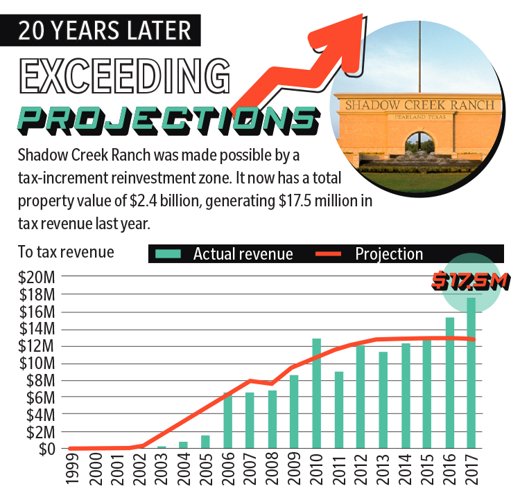 Shadow Creek Ranch was made possible by a tax-increment reinvestment zone. It now has a total property value of $2.4 billion, generating $17.5 million in tax revenue last year.