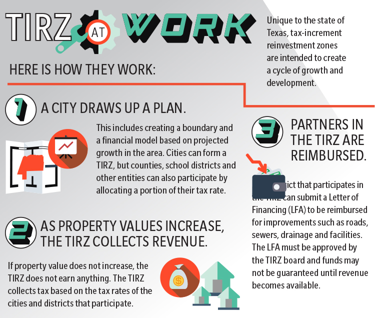 Under Texas law, an incorporated city can create a TIRZ to encourage the redevelopment of an area that might not otherwise thrive on its own. A TIRZ can help build roads, sewers and other public facilities.