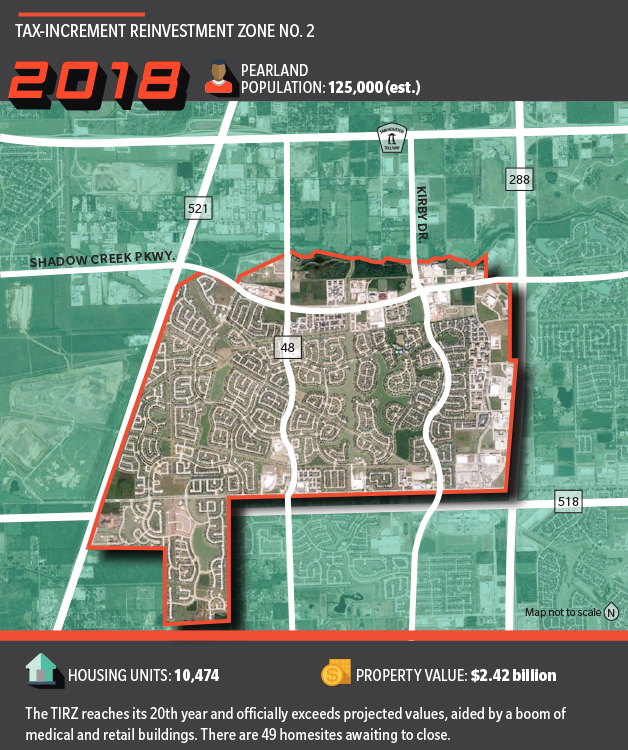 The tax increment financing zone, Pearland TIRZ No. 2, is one of the largest such entities in Texas with over 3,900 acres. It is also a public-private partnership that is paying long-lasting dividends, city officials and developers said, with property values now in excess of $2.4 billion. But most people know of this area by another name: Shadow Creek Ranch.